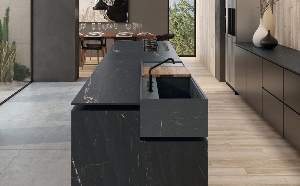 El fondo oscuro de la pieza contrasta con su veteado y le aporta a las cocinas y espacios el detalle distintivo y sobrio que tanto se busca hoy en día.