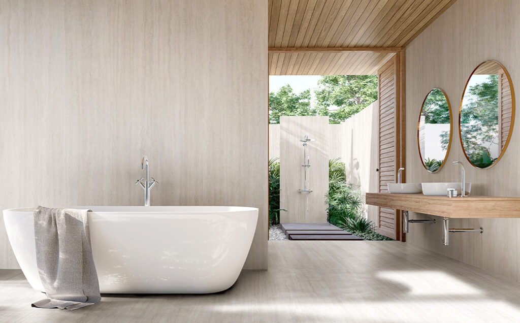 Travertino originario de la región de Tivoli, Italia. Se caracteriza por su color beige claro con vetas suaves y uniformes, lo que le da un aspecto elegante y sobrio.